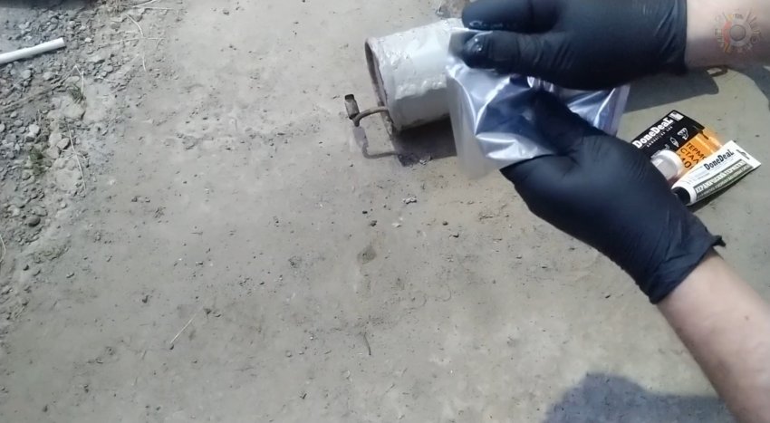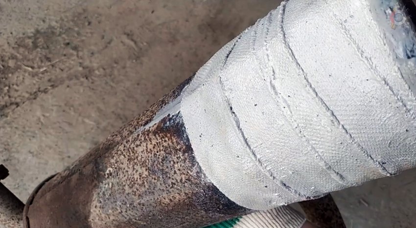 Далее растираем выдавленный из-под заплатки герметик и обматываем место ремонта с помощью высокотемпературной керамической ленты, применяемой для восстановления глушителей.