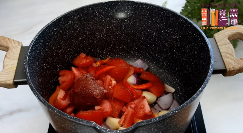 Готовим соус. На небольшом количестве растительного масла обжариваем нарезанный репчатый красный лук и болгарский перец. Добавляем чеснок целиком, 5-6 долек, резаные помидоры, острый перец по желанию.