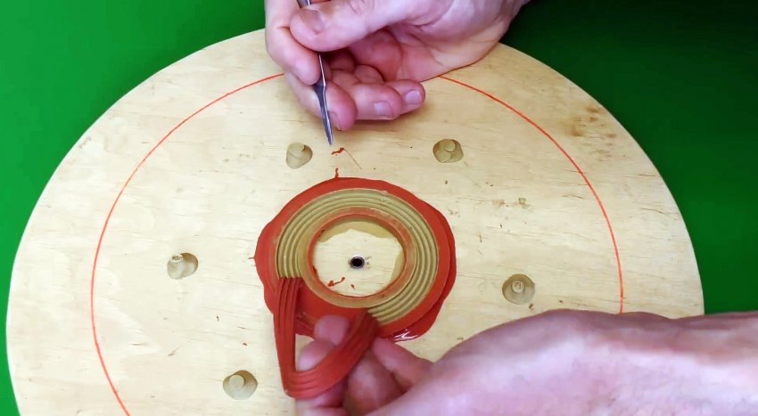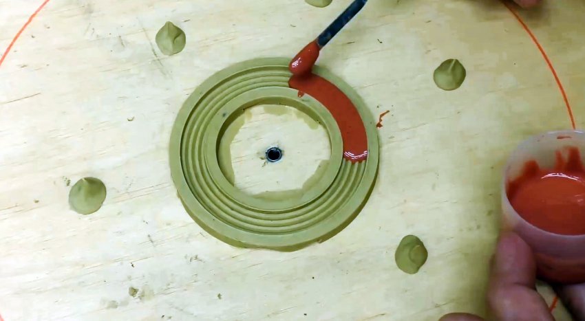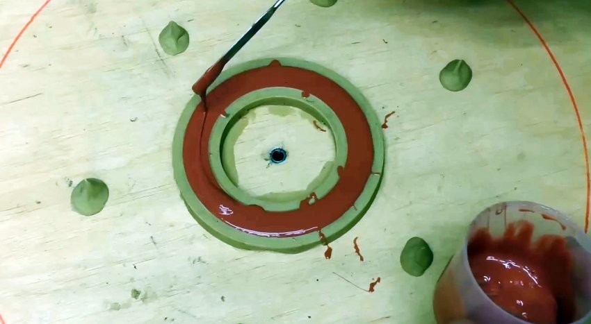 Формируем матрицу на поворотном столе из металла или фанеры, пропитав рабочую сторону лаком для лучшего прилипания пластилина. В центре сверлим отверстие и вставляем металлическую втулку. Тогда при работе скребком оно не будет разбиваться, обеспечит лучшую точность и прослужит намного дольше.