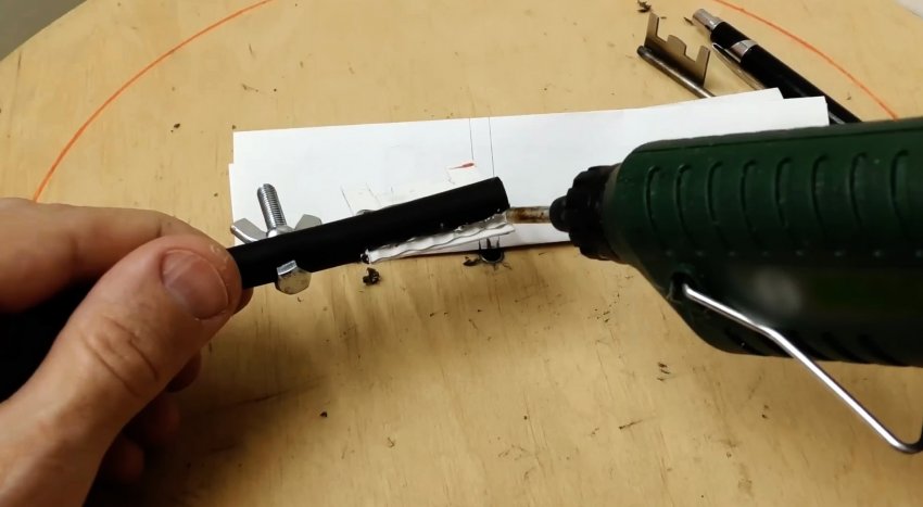 Закрепим лезвие скребка на трубке с прорезью, находим радиус скребка и сверлим в трубке отверстие в соответствии с размерами прокладки. В качестве ножки используем болтик с обычной гайкой и гайкой-барашком.