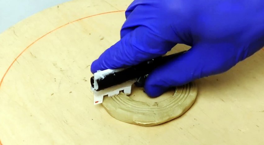 Выравниваем лезвие и закрепляем его горячим клеем. Пока клей не остыл, вносим коррективы. Далее формируем матрицу из пластилина на поворотном столе, учитывая размеры скребка и радиус его вращения. Если мы не угадали с количеством пластилина, то исправляем ошибку, нарастив недостающий участок.