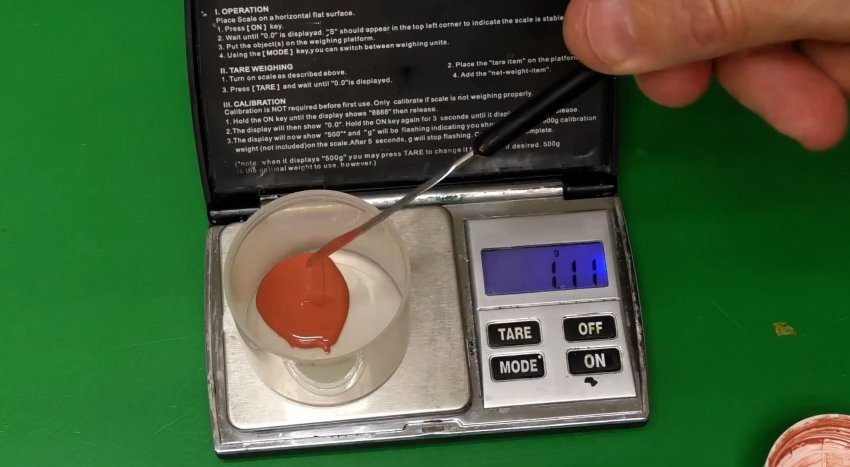 На основу по кругу налепим конусные упоры из пластилина. Они не дадут стеклу сдвинуться и выравнивать его будет легче. Пользуясь электронными весами, смешиваем пищевой силикон с отвердителем в нужной пропорции.