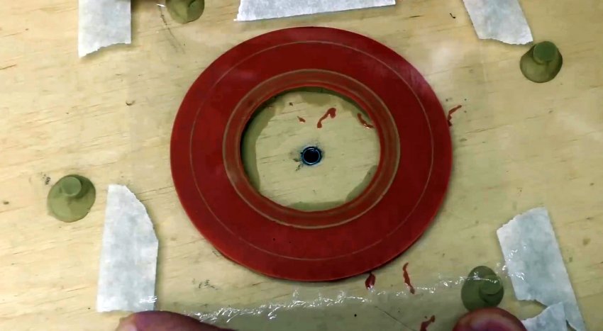 Если между стеклом и формой оказался воздух, то его удаляем наклоном стекла. Придавливаем стекло и добиваемся получения ровных окружностей. Теперь прокладка выйдет из формы чистовой и не потребует доработки.