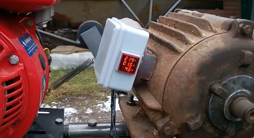 Начинаем испытания. Заводим мотоблок. Для контроля электрических параметров сети используется цифровой прибор. Отражаются три параметра: напряжение, ток, частота. На холостых оборотах мотоблока индикатор показывает напряжение 125 Вольт и частоту 36 Гц. Маловато, но электродрель уже работает. Прибавляем обороты мотоблока – напряжение 245 В, частота 48 Гц. Дрель заработала уже веселее. Ток потребления 1,6 Ампер. При работе болгарки напряжение проседает до 190 Вольт, потребляемый ток вырос до 2,9 Ампер.