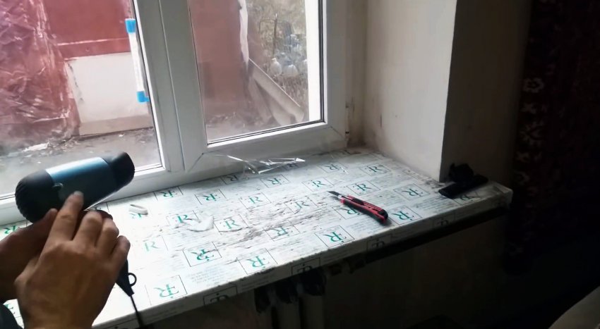 На поверхность скотча наклеиваем энергосберегающую пленку и равномерно прогреваем домашним феном с безопасного расстояния, задав соответствующую температуру теплогенерирующему прибору.