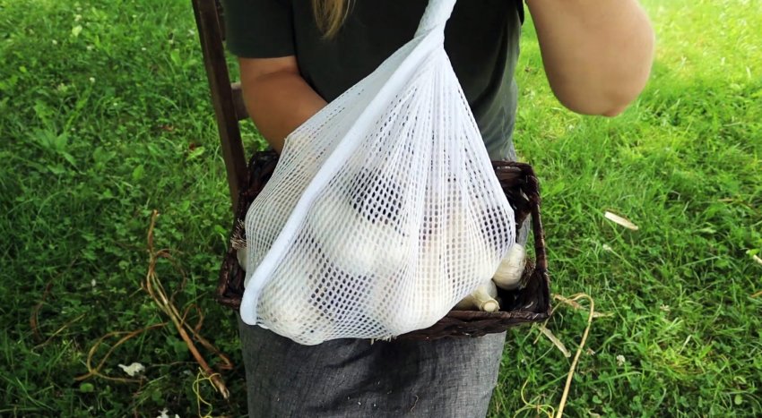 Нужно, чтобы в них была хорошая циркуляция воздуха. Без этого урожай загниет. Еще более практичным будет помещение чеснока в сетчатый мешок.