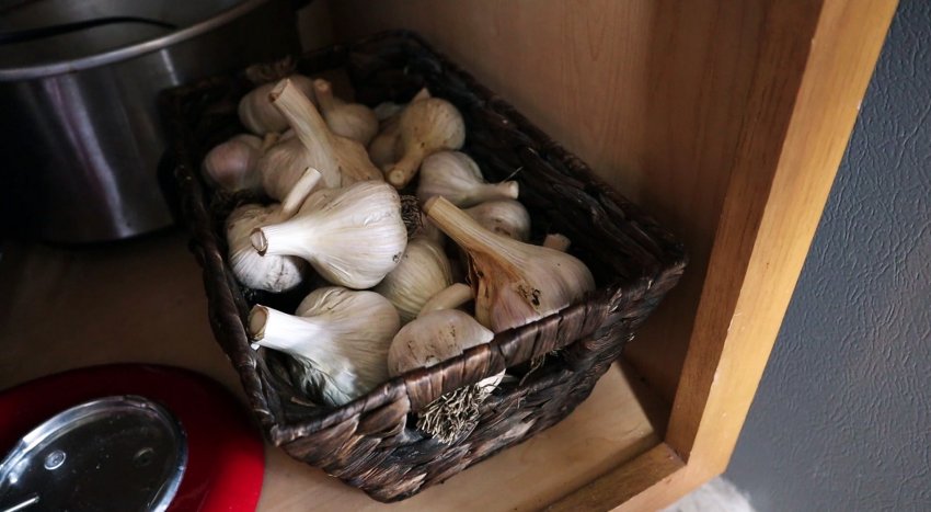 Чеснок нужно поставить в темное сухое место. Если все сложено в ящик или корзину, то для хранения подойдет нижний кухонный шкафчик. Сетку можно подвесить в кладовой. Хранить же чеснок в холодильнике, подвале или погребе не лучшая идея. Там он точно испортится.