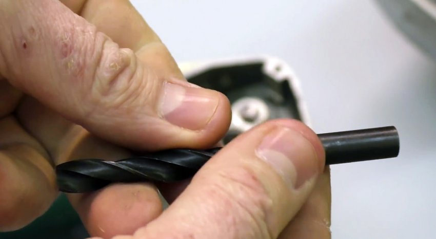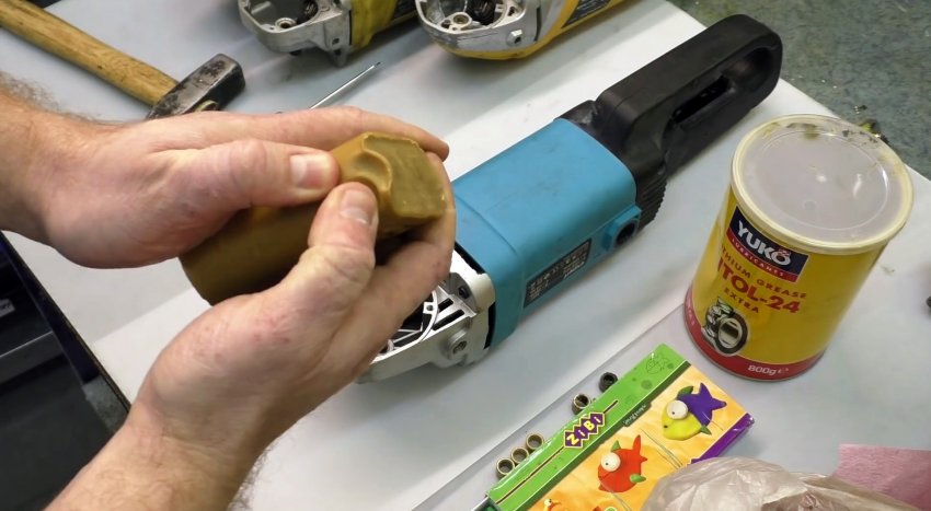 5. Для удаления изношенной втулки из посадочного места болгарки подойдет обычный пластилин для детей. Небольшой его кусочек, разминаем до некоторой пластичности и полностью заполняем им гнездо, в которое впрессовано втулка. Для создания давления используем хвостовик старого сверла, который вбиваем в гнездо молотком. В результате втулка через некоторое время выходит наружу.