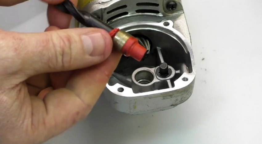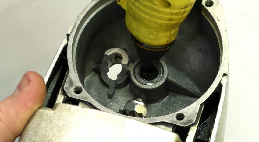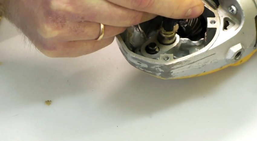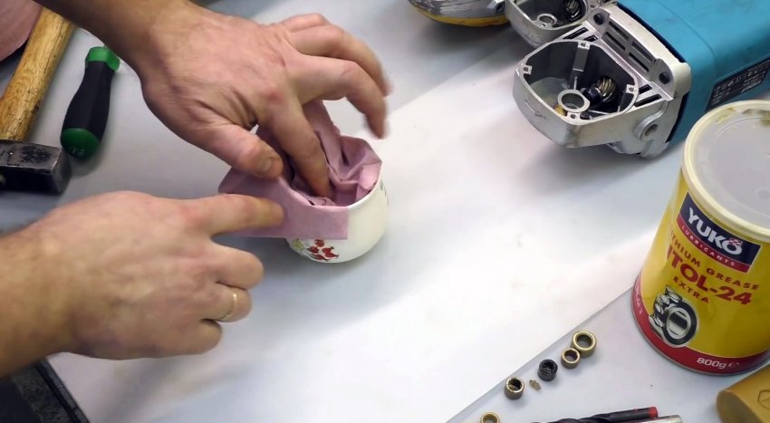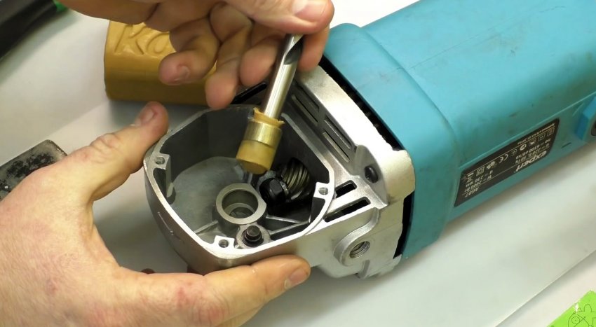 6. Чтобы удалить поврежденную втулку из гнезда в корпусе болгарки, можно использовать туалетную бумагу, замоченную в воде. Несколько отжимаем ее и заполняем гнездо, в котором запрессована втулка. Вбиваем поверх бумаги во втулку хвостовик такого диаметра, что и отверстие втулки.