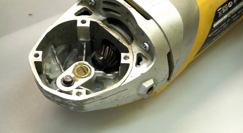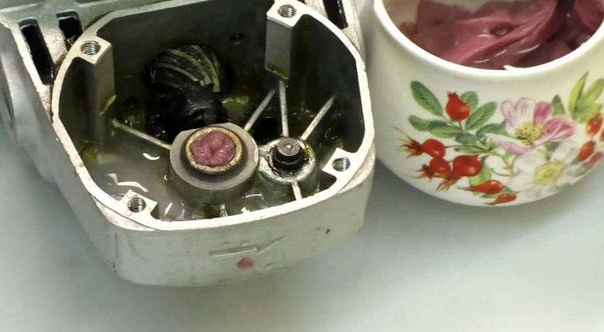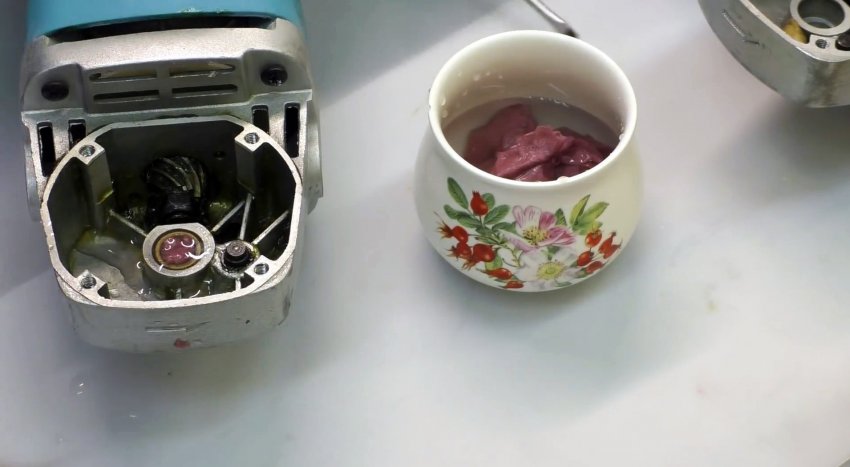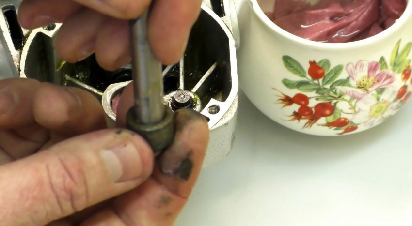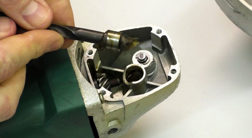 4. Для выпрессовывания втулки их гнезда в корпусе болгарки подойдет хозяйственное мыло, т. к. оно достаточно вязкое и очень скользкое. Мыло маленькими кусочками закладываем в гнездо втулки до предела и хвостовиком подходящего негодного сверла, которое вбиваем в гнездо, создаем давление.