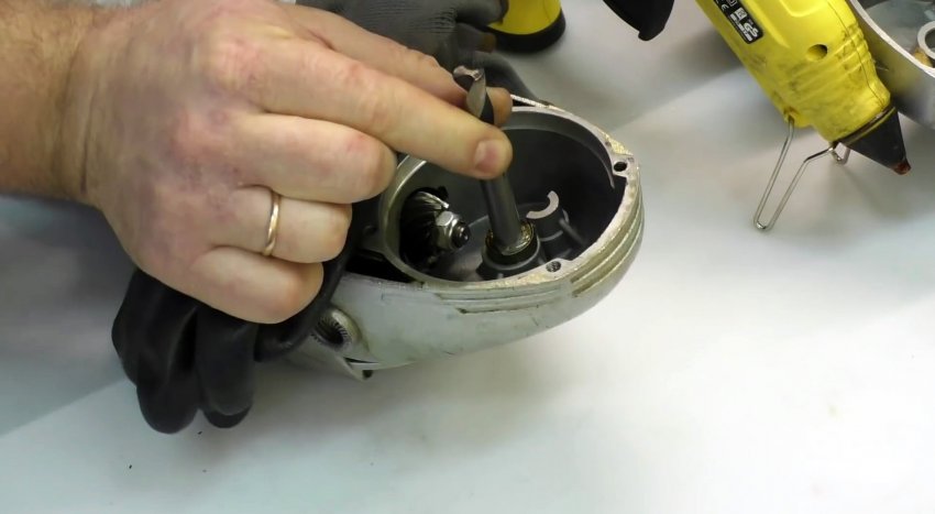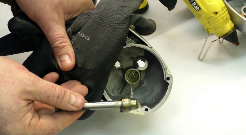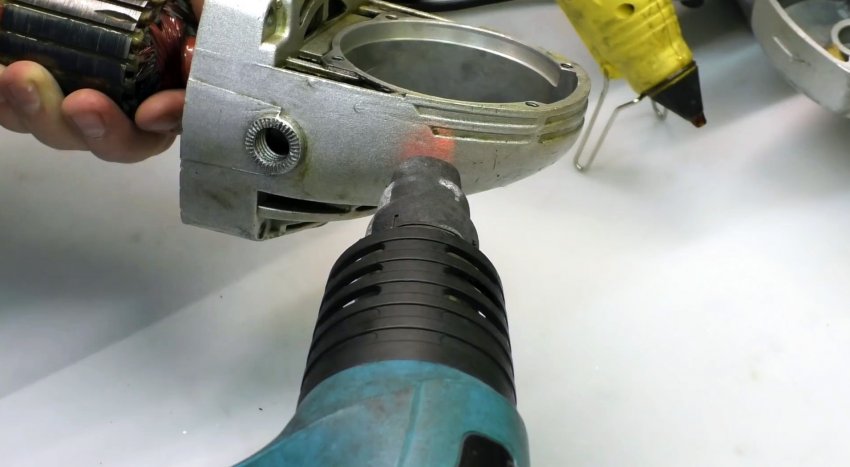 7. С целью удаления поврежденной втулки из гнезда в корпусе болгарки используем клеевой пистолет, но предварительно нагреваем корпус в районе гнезда газовой горелкой.
