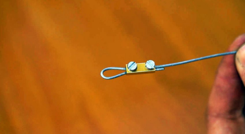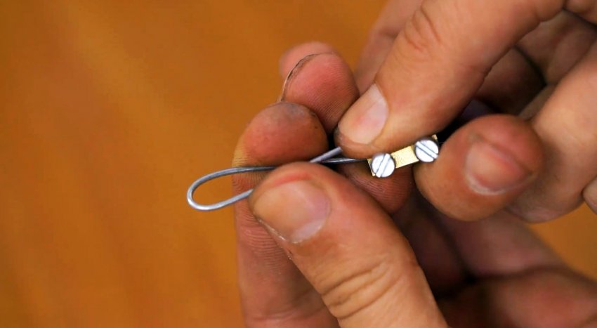 Отделяем от клеммной колодки один элемент и извлекаем из него контактный узел – латунную трубку с двумя винтами. Заводим в контактную трубку конец провода при вывернутых винтах, изгибаем его на 180 градусов и вновь заводим конец в контактную трубку с другой стороны, оставляя снаружи петлю. Затягиваем винты на контактной трубке. Полученная петля будет надежным креплением для зацепа пружины растяжения.