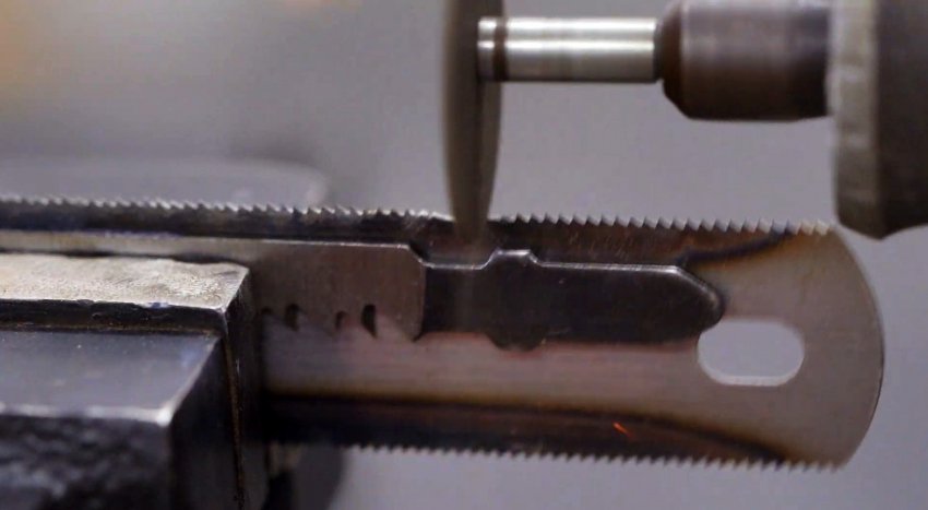 Прикладываем лобзиковую пилку к полотну по металлу в продольном направлении чуть ниже зубьев в тиски и болгаркой формируем узел крепления, подобный лобзиковой пилке.