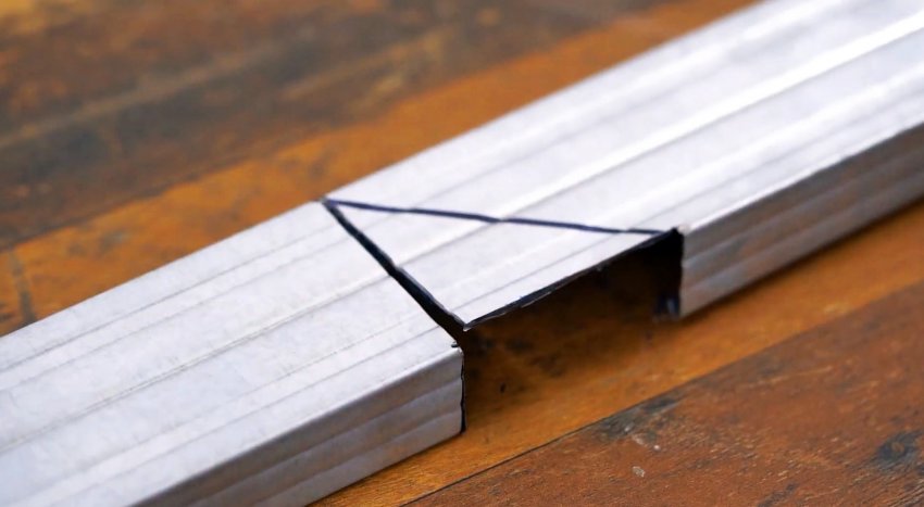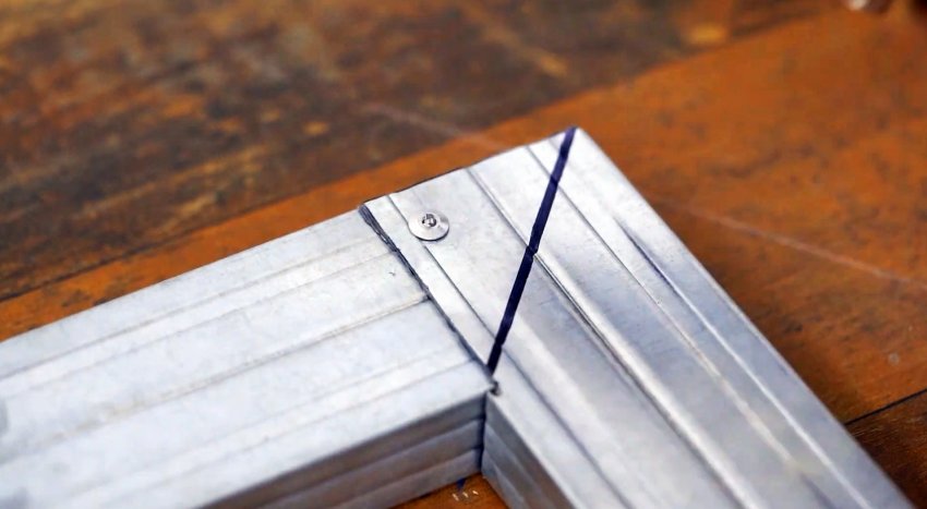 По спинке профиля проводим поперечную линию. Откладываем от ее конца вдоль грани линию, равную по длине первой. Соединяем полученную точку с верхним концом поперечной линии. Концы поперечной и диагональной линий продолжаем по узкой стороне профиля. Разрезаем профиль по проведенным линиям. Вырезаем узкую сторону между разрезами по грани. Сгибаем профиль до упора и получаем угол 90 градусов. Треугольный фрагмент одной части профиля накрывает спинку другой. Сверлим в них отверстие и крепим заклепкой.