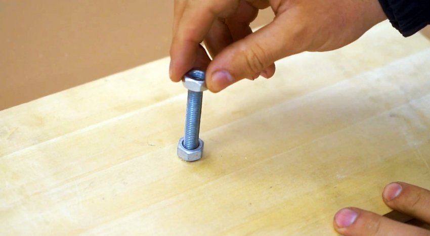 В основание из дерева вворачиваем шпильку, фиксируем гайкой и навинчиваем вторую гайку.