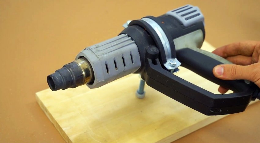 Половину сантехнического хомута гайкой наворачиваем на конец шпильки и укладываем в нее газовую горелку по силовому пояску на корпусе. Второй половиной хомута охватываем силовой поясок сверху и затягиваем стяжные болты. Теперь обе руки свободны, чем облегчаем и ускоряем работу.