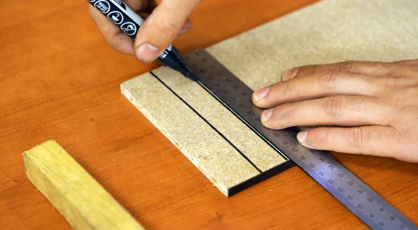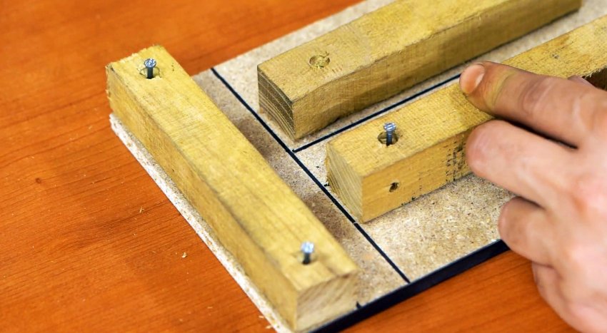 Крепим 3 деревянных бруска к полосе из ДСП гвоздями. Один размещаем поперечно по краю полосы ДСП, а два других крепим симметрично центра полосы и параллельно друг другу. Расстояния между брусками должно быть не менее толщины щитов. Между параллельными брусками помещаем первый щит, упирая его в поперечный брусок.