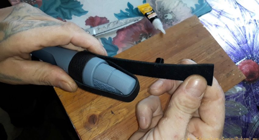 Надеваем заготовку на ножны с ножом, и примеряем тонкую полосу от стыков заготовки на тыловой внутренней стороне, поверх рукояти ножа, до конца полосы на основании ножен.