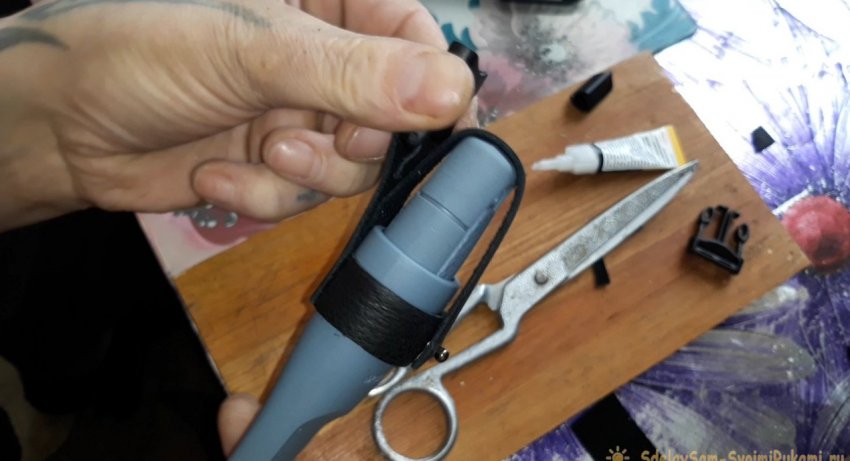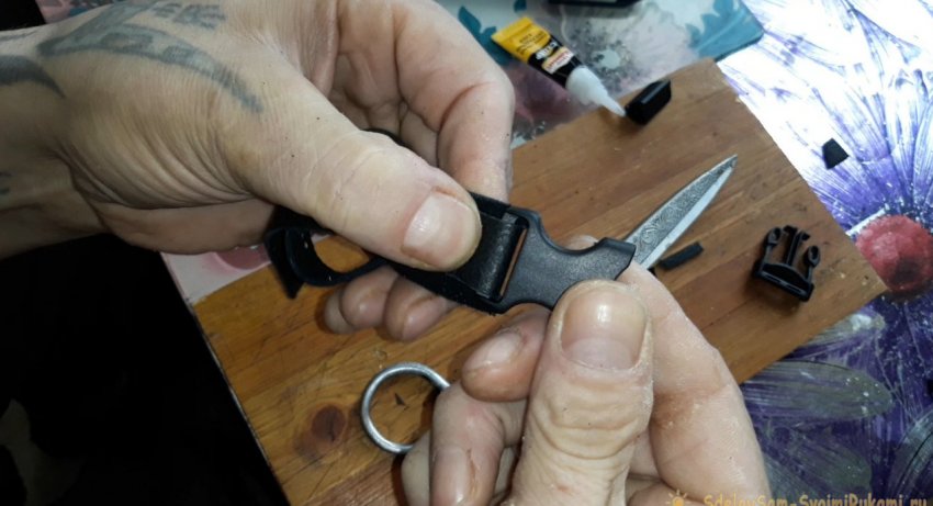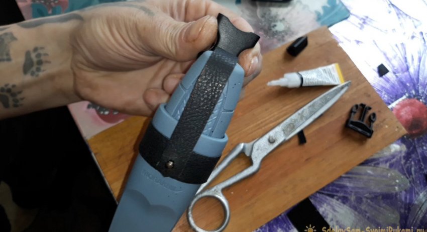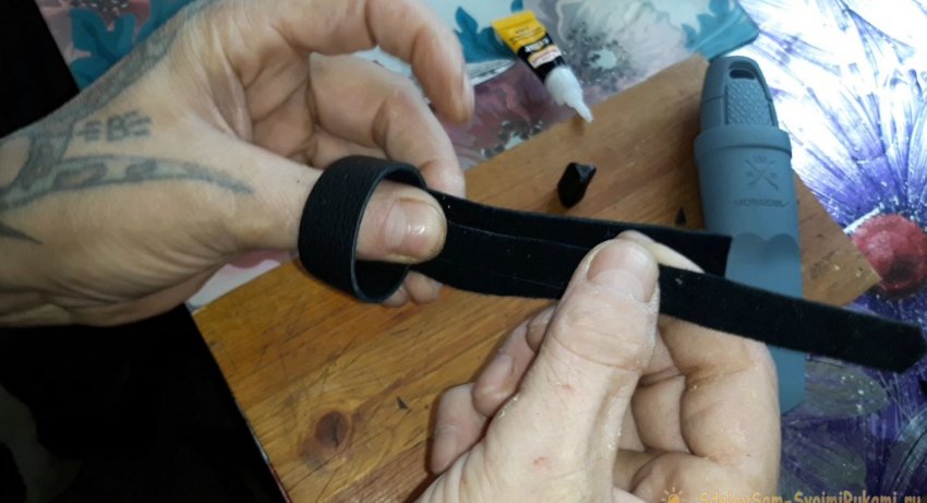 Если отверстие окажется маловато, просто нужно сделать ножом надрез с верхнего края, вглубь ремешка, миллиметра 2. Главное, чтобы оно не оказалось большего диаметра. Далее, нужно приклеить к краю широкой полосы одну из половинок пластмассовой застежки. Такие застежки обычно бывают на ремнях рюкзака. Итак, сгибаем широкую полосу внутрь таким образом, чтобы её сгиб был на уровне конца рукояти. Продеваем в сгиб половину застежки, и приклеиваем конец полосы к его продолжению изнутри. Вот так: