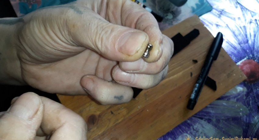 Она на винтовом креплении. Продается в любом магазине бижутерии. Сверлим в отмеченном месте отверстие на 1,5 миллиметра, и закрепляем в нём застежку.
