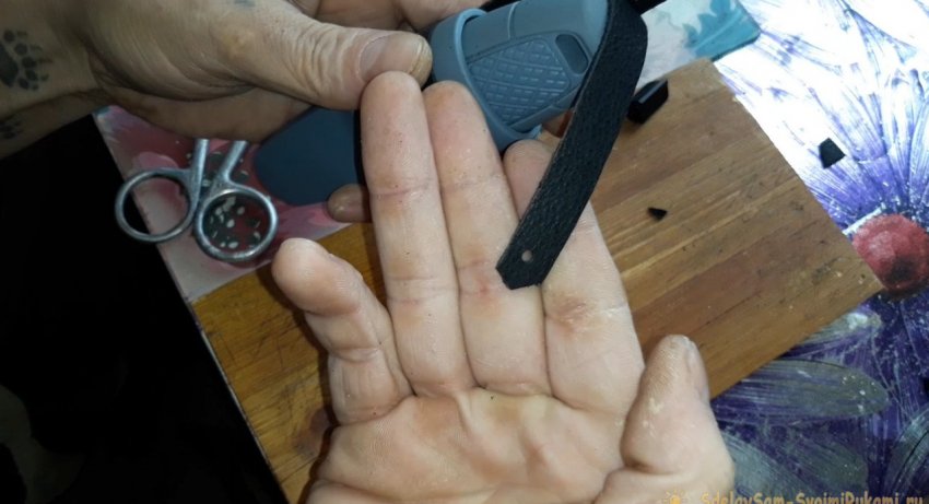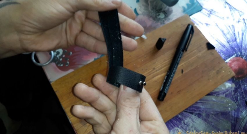 Можно с внутренней стороны застежки приклеить на головку вина кусочек кожи, чтобы он не царапал ножны. Теперь нужно проделать отверстие на ремешке крепления, для застежки. Примеряем ремешок, отмечаем место отверстия, и высверливаем его трубкой подходящего диаметра.