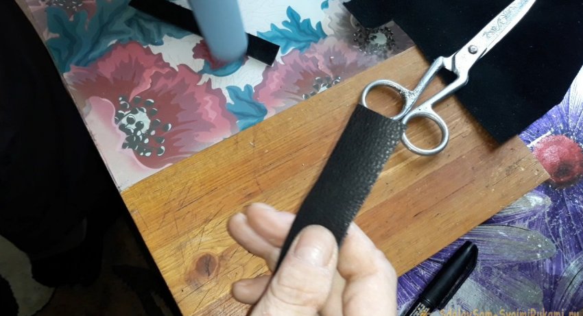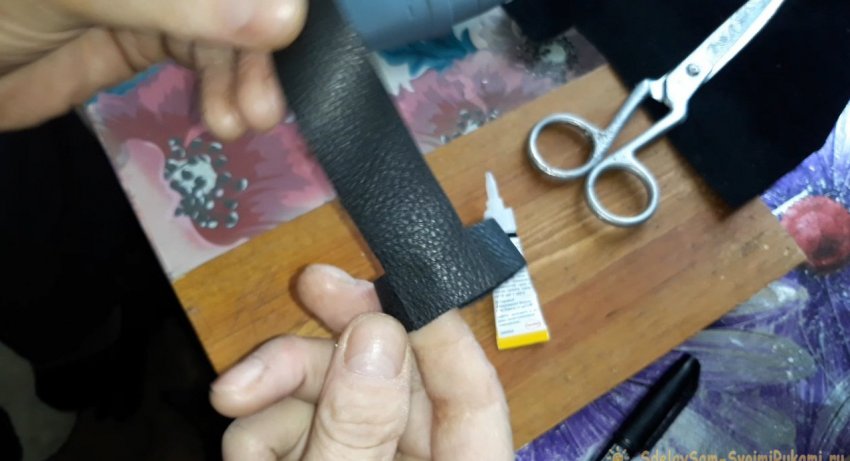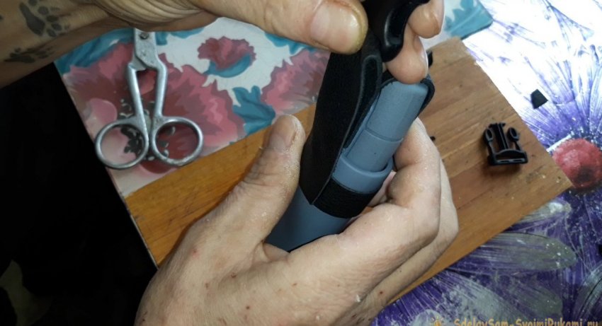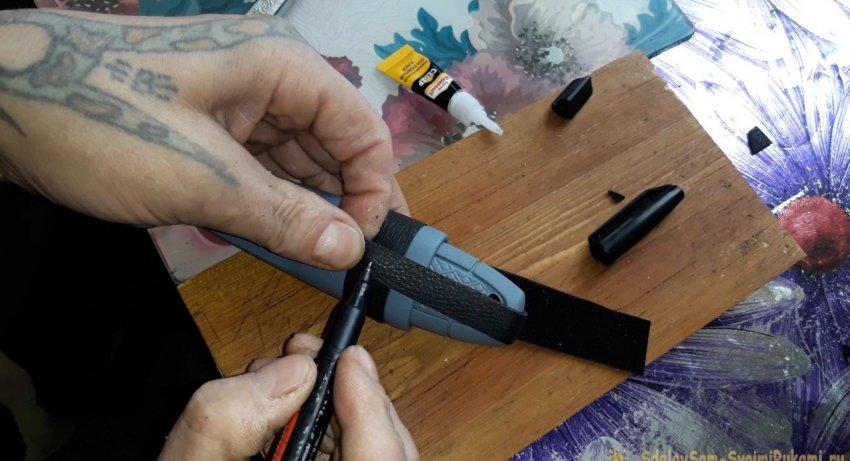 Обернув полоску вокруг основания ножен, замерьте маркером место соединения стыков и отрежьте.