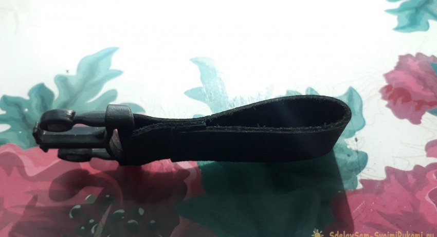 Осталось сделать хлястик для поясного ремня, из полоски кожи и второй половины застежки. Отрезаем ещё одну длинную полоску кожи, учитывая ширину своего поясного ремня с обеих сторон, и с запасом ещё пять сантиметров. Ширина должна быть такая, чтобы ремешок можно было продеть в застежку. Продеваем в него вторую половинку застежки на 2 сантиметра. Наносим клей по обе стороны застежки, и склеиваем. Второй конец ремешка приклеиваем у петли застёжки таким образом, чтобы получившийся хлястик можно было продеть в ремень. Вот такая штуковина должна получиться:
