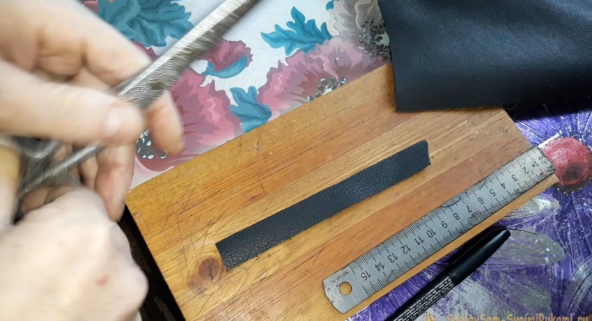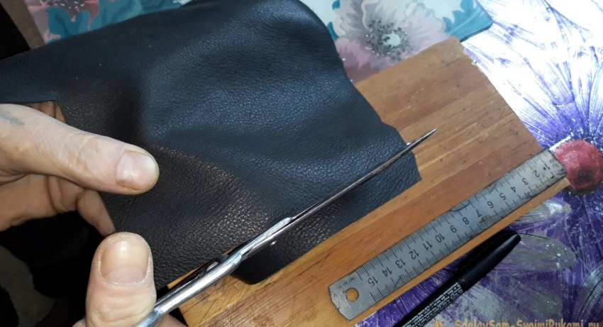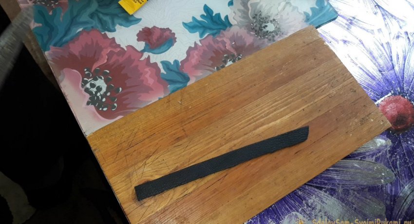 Кусок кожи разместите на ровной поверхности и, отмерив линейкой полоску 1,5 на 15 сантиметров, отрежьте её ножницами.