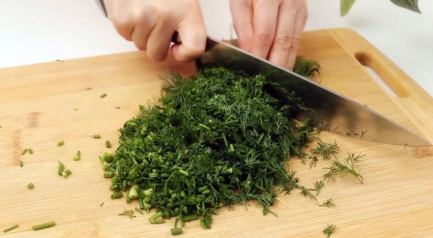 Мелко нарезаем укроп или другую любимую зелень.