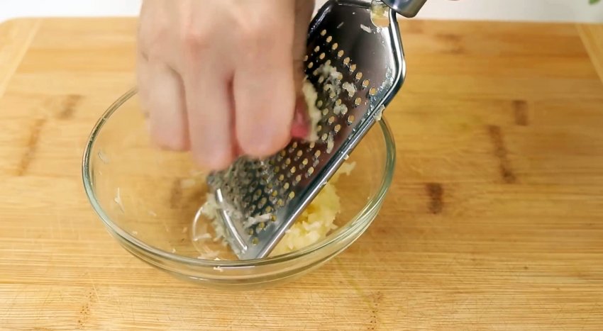 Натираем на мелкой терке или выдавливаем через пресс чеснок.