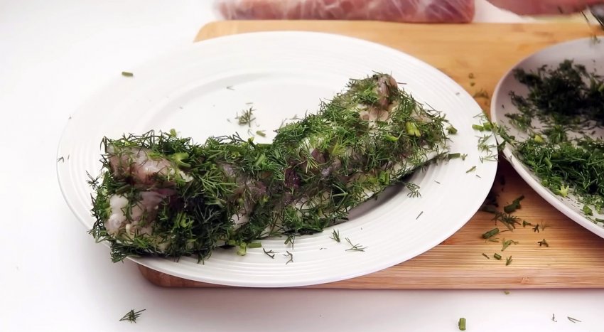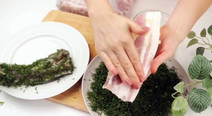 Натираем грудинку чесноком и обмакиваем в зелени.