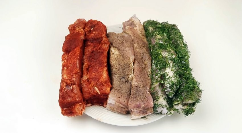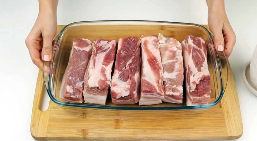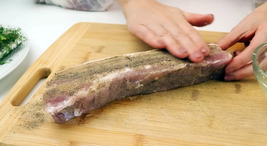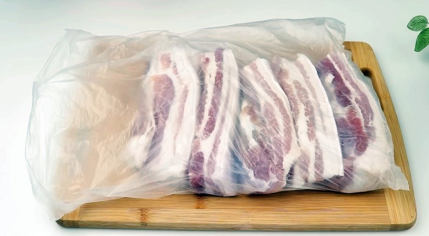 Промываем грудинку, оставляем в дуршлаге или сите, чтобы стекла лишняя вода. Можно дополнительно промокнуть куски грудинки хлопчатобумажной тканью или бумажными полотенцами. Упаковываем мясо в полиэтиленовые пакеты и отправляем в морозилку на 1-1,5 часа.