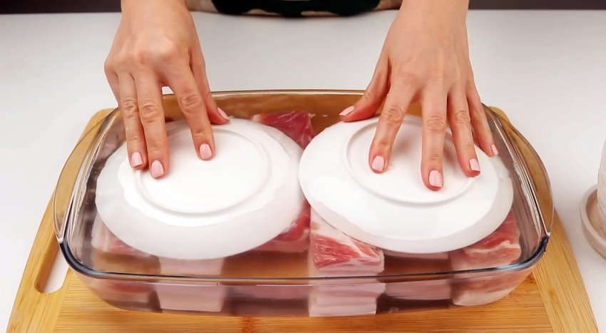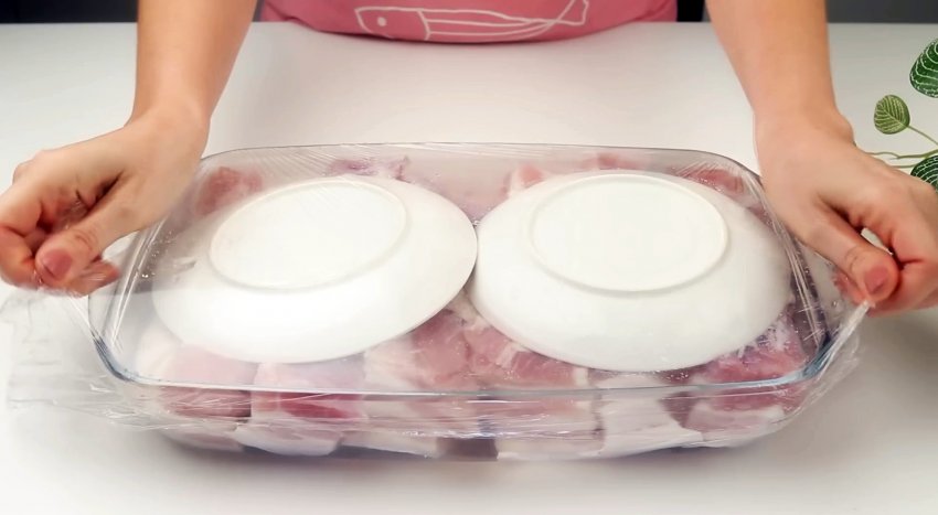 Накрываем тарелками или другой посудой, создавая тяжесть или «гнет». Упаковываем емкость с мясом в пищевую пленку и оставляем при комнатной температуре на 2 дня в месте, не допускающем открытого солнечного света.
