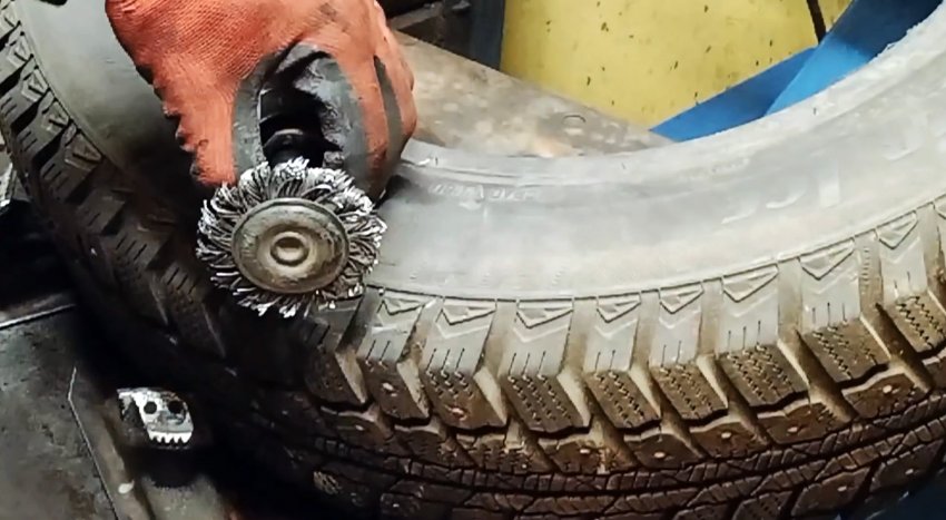 Резину вокруг удаленного места зачищаем бормашинкой с металлической щеткой, которая меньше нагревает материал. Для удобства дальнейшей работы помещаем шину на бортовой расширитель и раздвигаем борта покрышки.