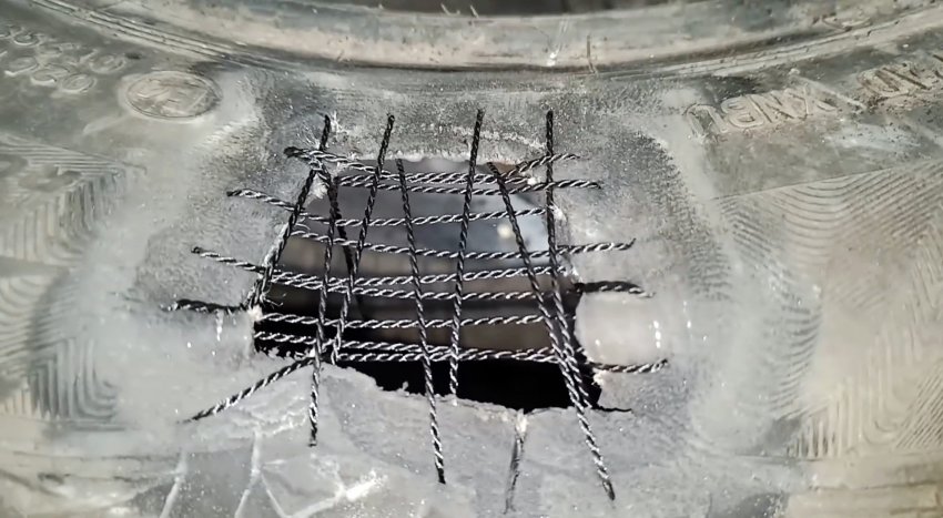 Для того, чтобы исключить вздутие при накачивании покрышки, до приклейки пластыря стягиваем поврежденное место с помощью термостойкой нейлоновой нитки. При этом допустимы небольшие складочки.