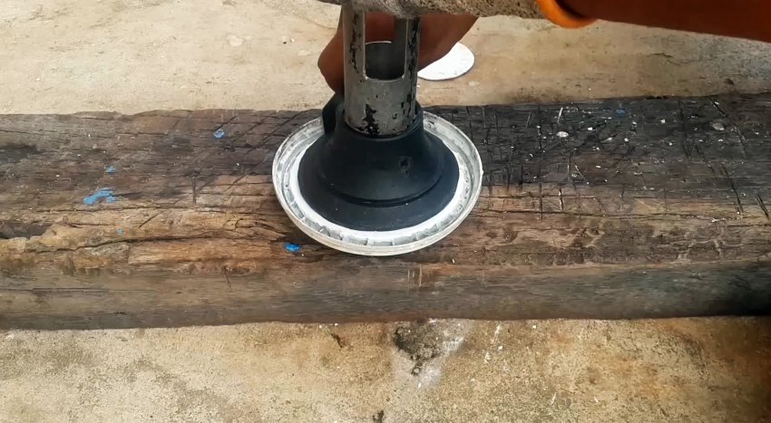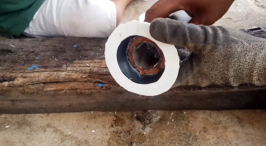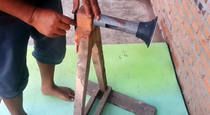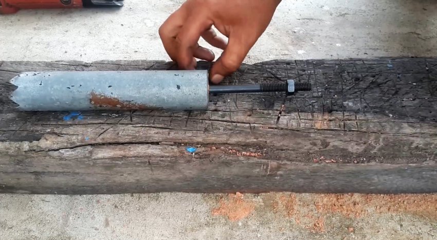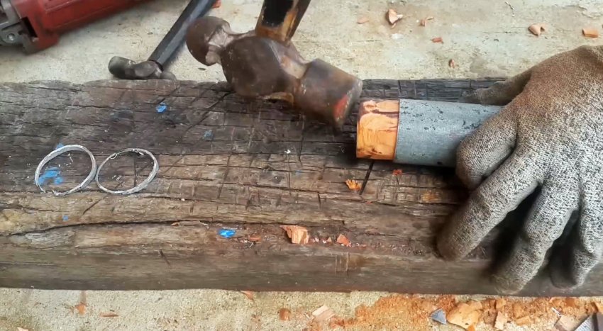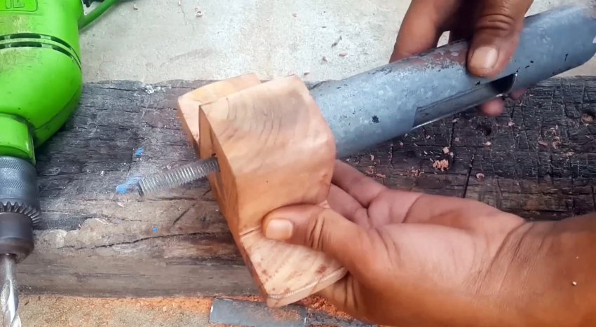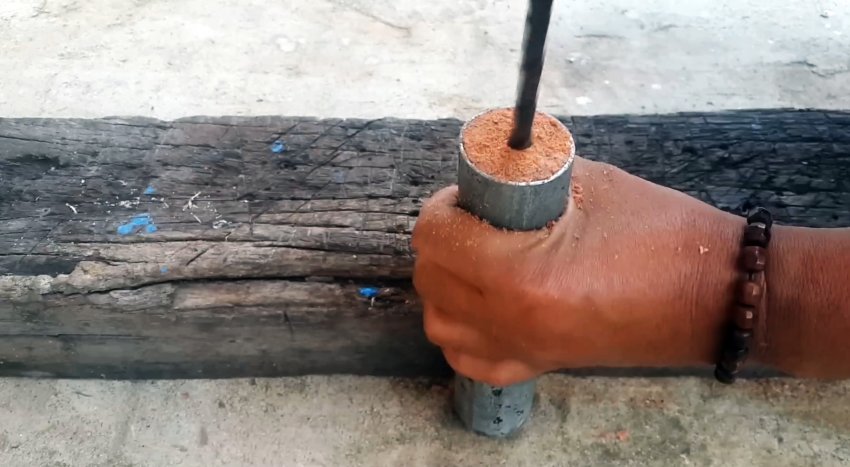 Стесываем болгаркой одну сторону цилиндра на небольшой конус и забиваем его молотком в плоский торец трубы заподлицо. Сверлим в этой деревянной пробке по центру отверстие с помощью дрели.