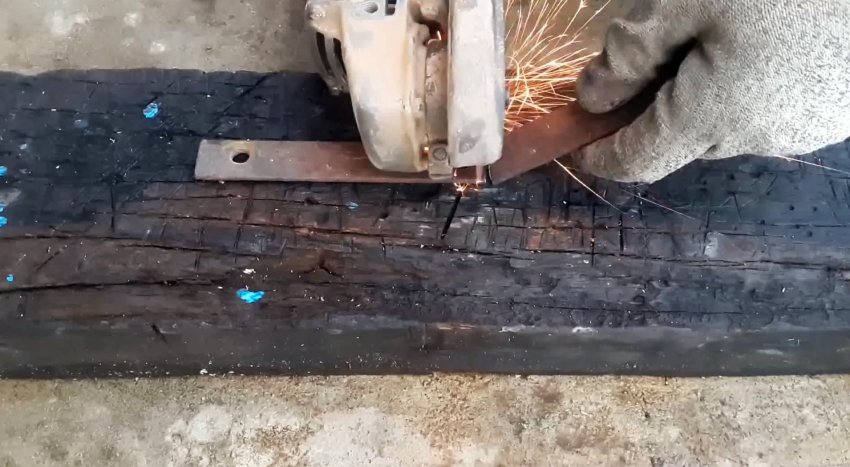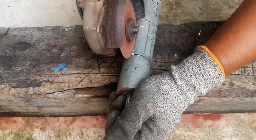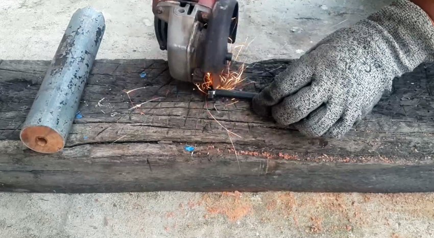 С помощью металлической линейки определяем и отмечаем снаружи трубы сечение конца болта. От этого сечения намечаем 2 прямоугольные продольные прорези в диаметральном направлении и вырезаем их посредством болгарки. Кромки сглаживаем наждачной бумагой.