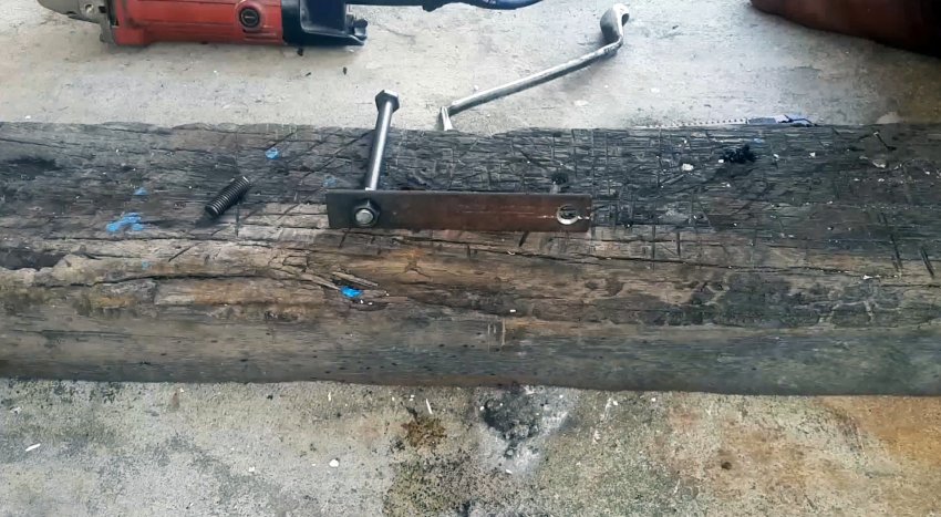 На стержень болта надеваем стальную пластину по одному из двух отверстий по ее концам, которую с двух сторон затягиваем гайками. Часть стержня за внешней гайкой отрезаем болгаркой. Во второе отверстие вставляем подобный первому болт и также затягиваем двумя гайками.