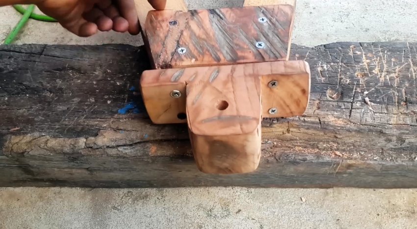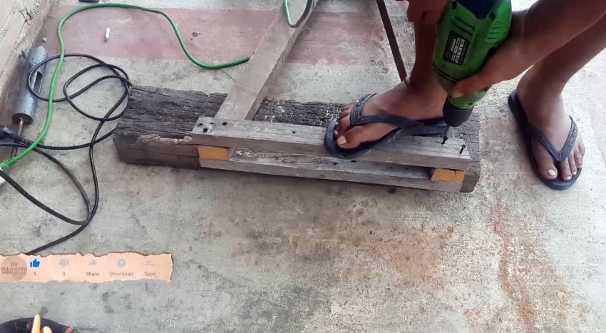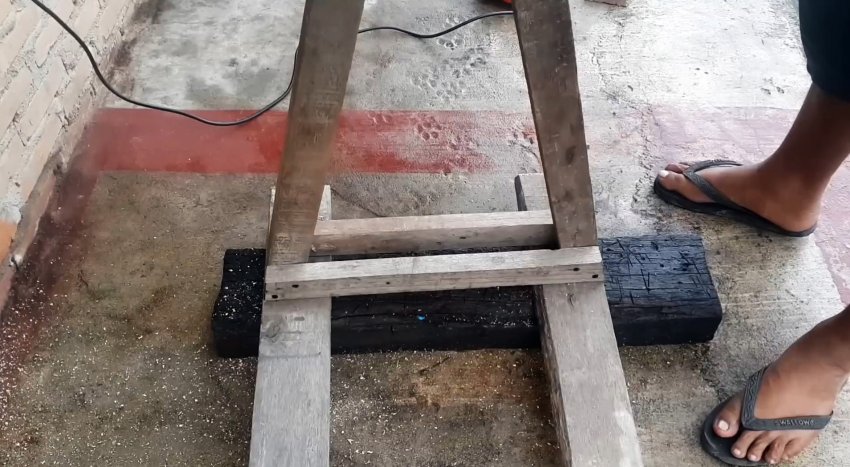 Из старых досок и брусков на шурупах собираем прочную и жесткую стойку с устойчивым основанием.