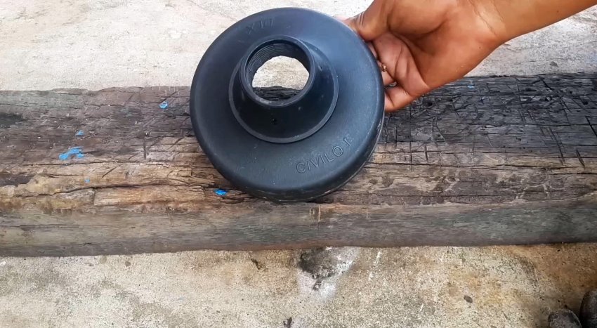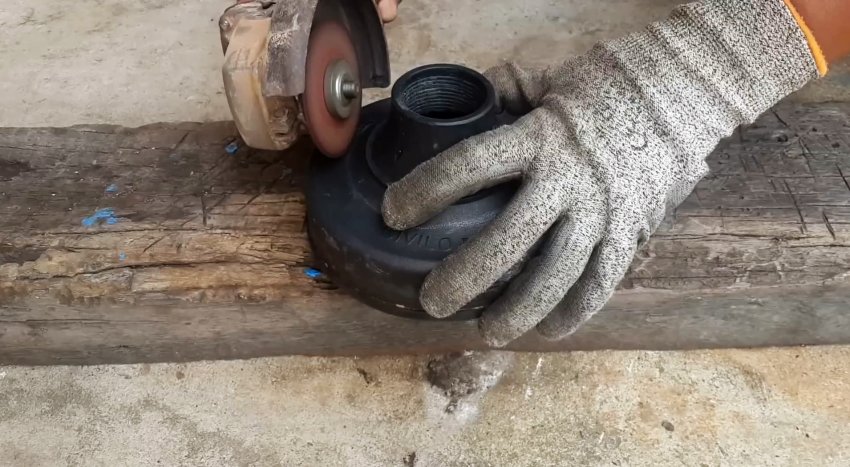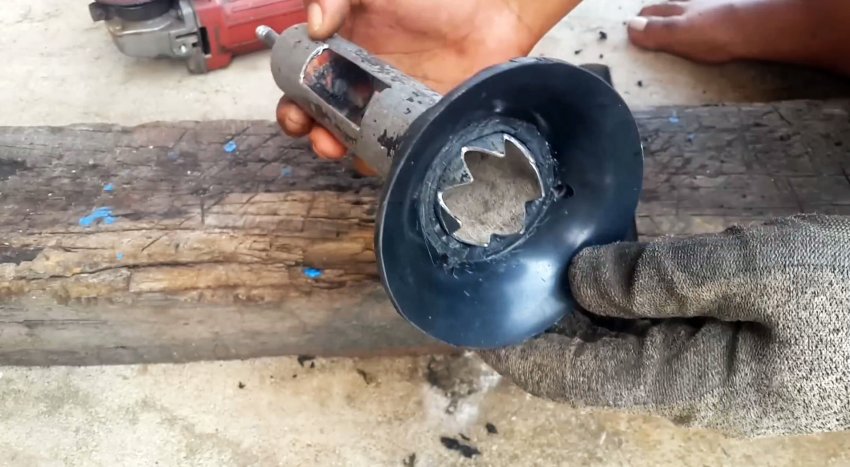 Отрезаем болгаркой от пластикового круглого кожуха с центральным выступом со сквозным отверстием периферийную часть крышки вместе с цилиндрической отбортовкой. В отверстие вбиваем трубу, ударяя по гладкому торцу молотком, пока зубцы полностью не выйдут из отверстия.