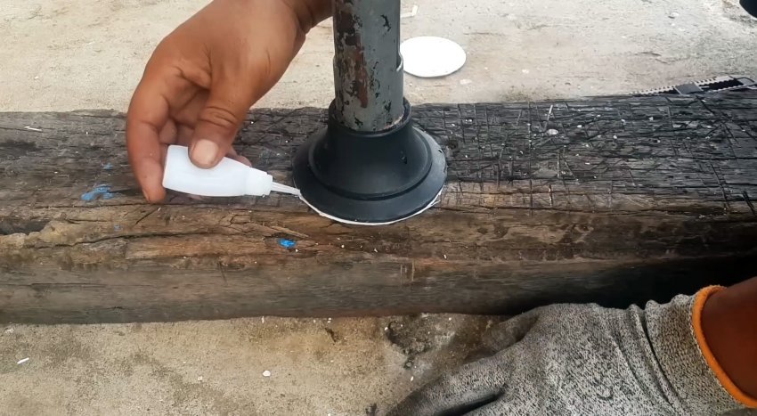 К торцу пластиковой детали приклеиваем кольцо из прозрачного пластика с помощью суперклея. Болтовой стержень, закрепленный в трубе, вставляем в отверстие деревянной опоры и с обратной стороны затягиваем гайку. Затем на стержень надеваем пластину и также затягиваем гайкой.