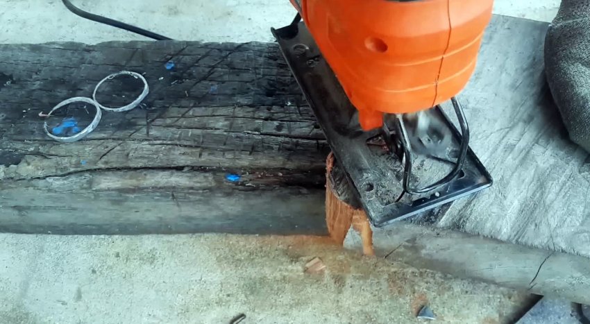 Ровный торец круглой трубы с зубцами на другом конце устанавливаем вертикально на угол доски, обводим карандашом ее наружный периметр и с помощью фрезера по полученному контуру вырезаем цилиндр.