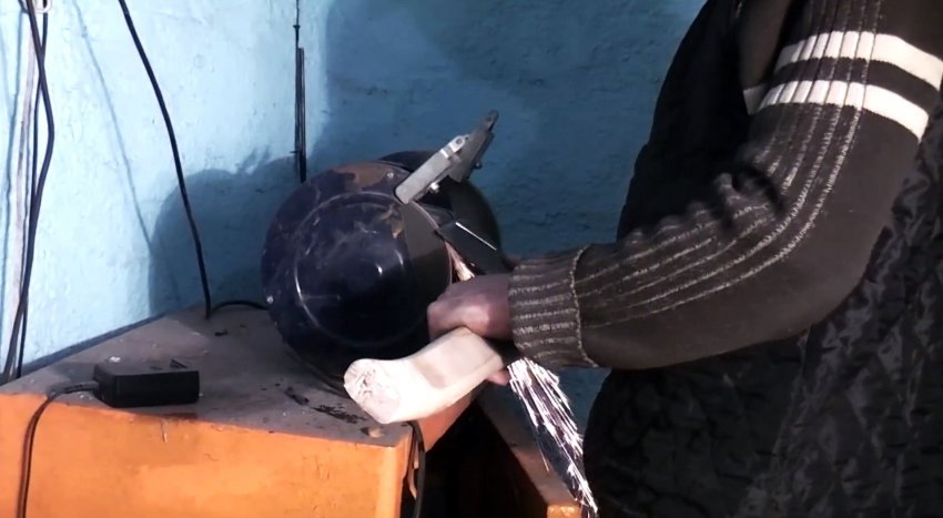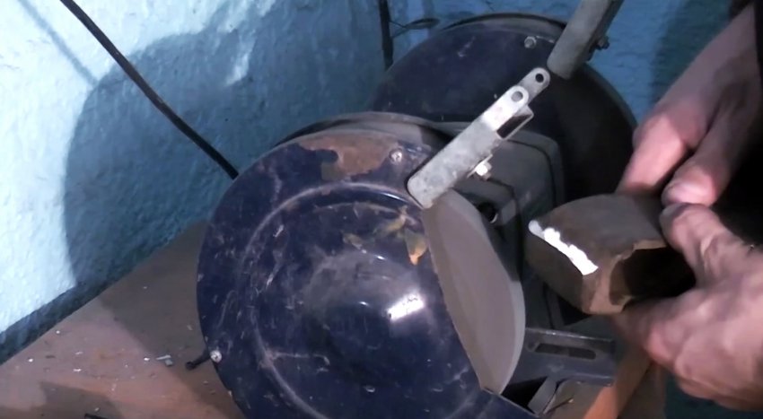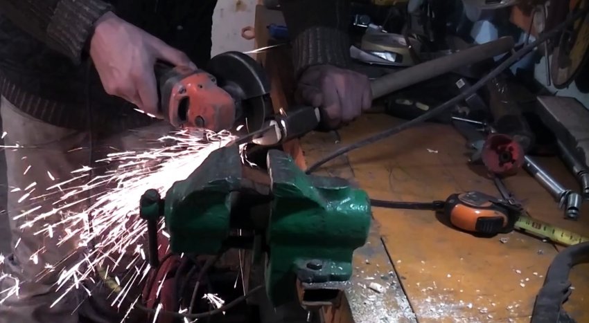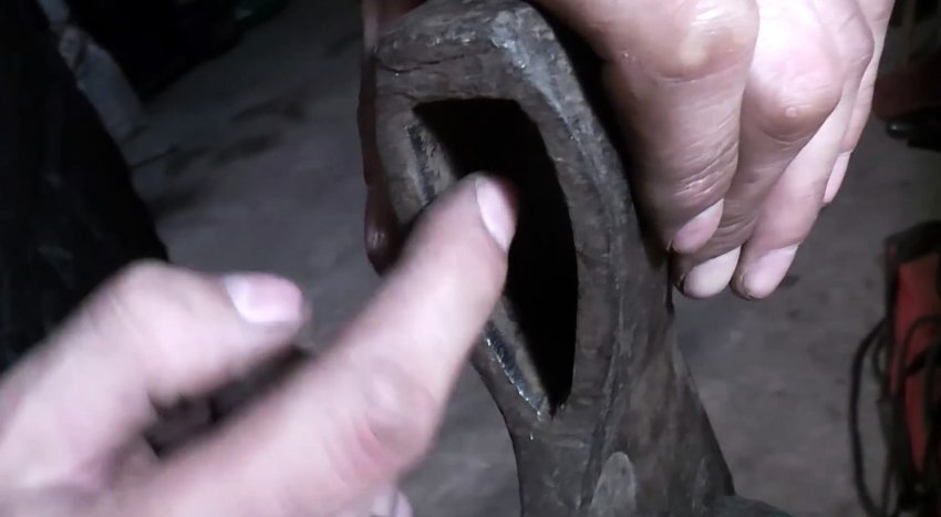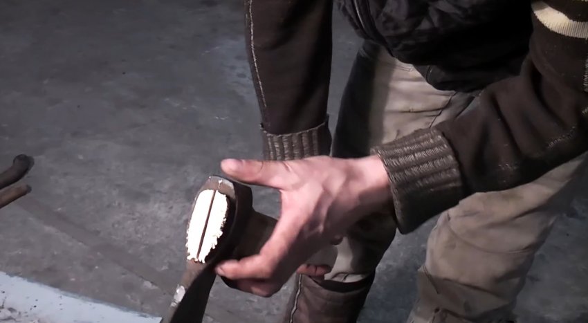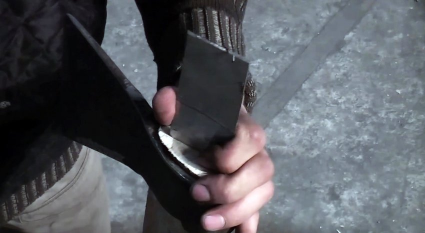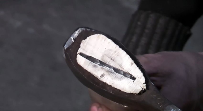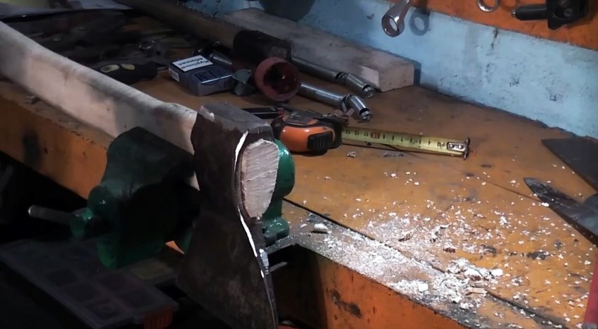 Отрезаем верхнюю часть стального клина болгаркой, оставляя примерно около 1 см снаружи. Эту оставшуюся часть клина забиваем молотком в топорище заподлицо с его торцевой плоскостью.