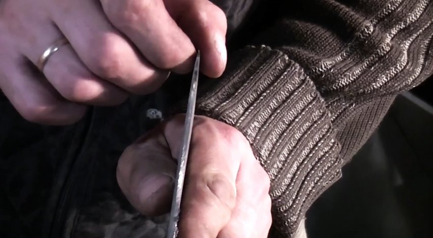 На заточном станке из подходящей по толщине и ширине стальной пластины формируем конусообразный клин и забиваем его в топорище наискосок, т. е. по диагонали, чтобы распереть посадку деревянной ручки в головке топора по четырем углам и всему периметру проушины.