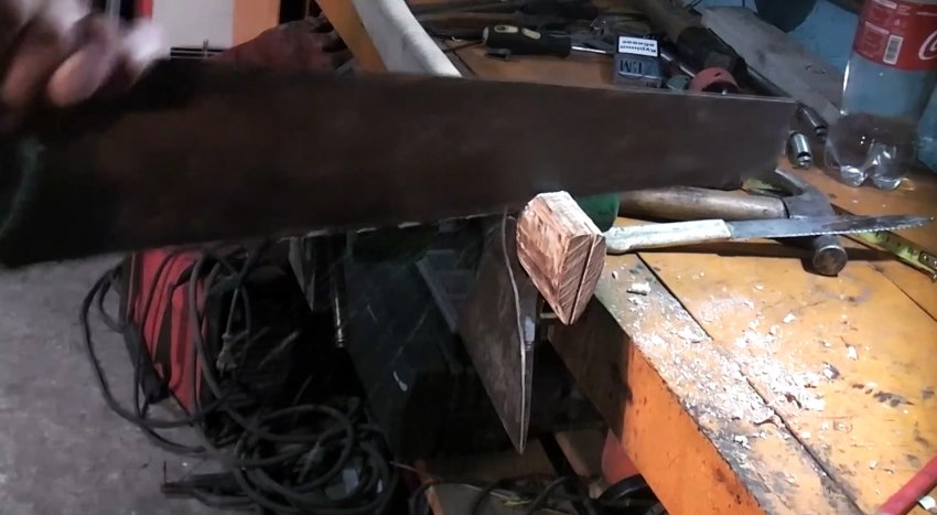 Оставляем примерно 1 см топорища от края проушины и отрезаем ручной ножовкой выступающую из проушины часть ручки, из которой в дальнейшем изготовим клин для укрепления головки топора на топорище.