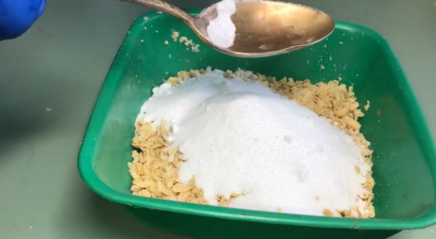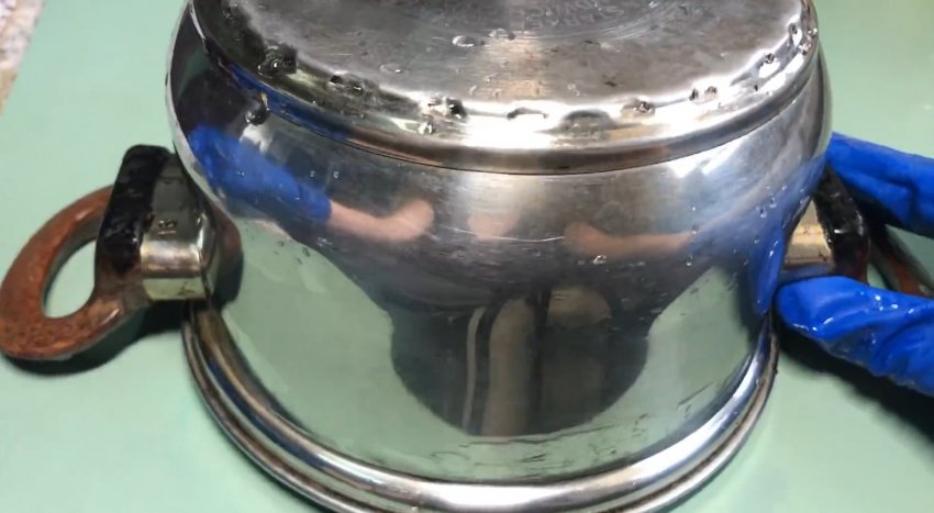 В полученный водный раствор с чистящими средствами помещаем освобождаемую от нагара посуду из разных материалов, учитывая их габариты, то есть в начале размещаем наибольшую емкость, в нее вкладываем среднюю и в конце самую маленькую.