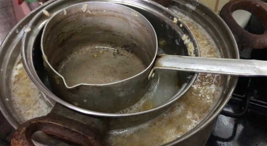 Ставим кастрюлю с водой и набором очищаемой посуды на конфорку газовой плитки и подогреваем на медленном огне в течение примерно 60-ти минут. За такой временной отрезок нагар набухает, становится несколько ноздреватым, размягчается и появляется возможность его удаления без больших затрат физических сил и времени.