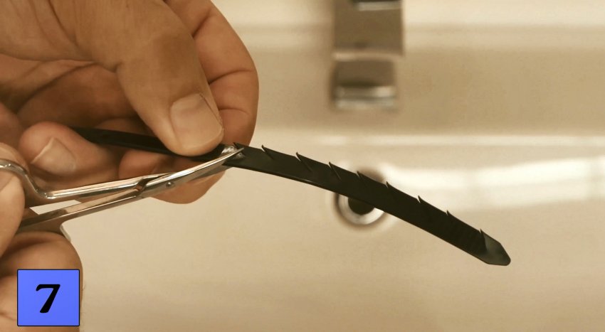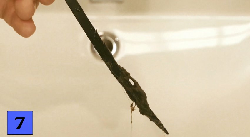 Это можно сделать с помощью ленты стрипа, выполнив на ней с двух сторон неглубокие надрезы ножницами под углом около 45 градусов к ее продольной оси, в направлении от замка к концу ленты. Теперь, просовывая ленту с надрезами в отверстия канализационного слива, перемещаем ее вверх-вниз и вытаскиваем. Так можно освободить слив от волос, ворсинок, шерсти домашних животных и т. д.