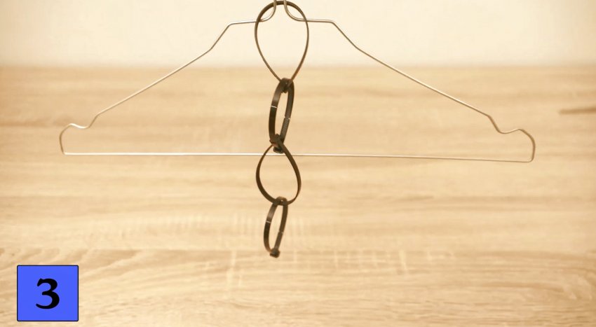 Обхватываем основание крючка вешалки (плечиков) кабельной стяжкой и затягиваем, оставляя небольшое кольцо. В полученное кольцо вставляем ленту второго стрипа и т. д. Теперь на кольца из пластиковых хомутиков можно дополнительно повесить одежду и, тем самым, увеличить вместимость шкафа.