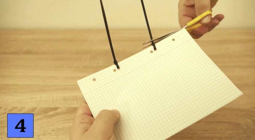 С помощью дырокола пробиваем сбоку листов 2-3 отверстия, заводим в них концы лент пластиковых хомутов, туго затягиваем замки и отрезаем выступающие за пределы замка концы лент. Теперь листы бумаги представляют собой блокнот и никуда не разлетятся даже при большом желании это сделать.